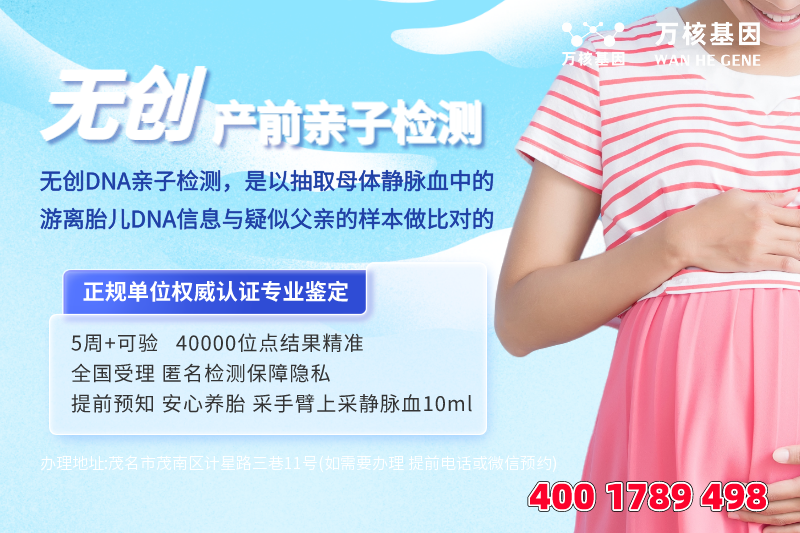 产前无创亲子鉴定也叫孕期静脉血胎儿亲子鉴定、无创胎儿宝宝亲子鉴定,在怀孕早期,即5周以上,从孕妇手臂上取静脉血,只需约10毫升即可进行DNA亲子鉴定。孕妇静脉血中含有胎儿游离DNA,能准确识别胎儿是否出生。那么,在茂名茂南做产前无创亲子鉴定哪里可以做?